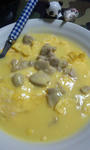 晩飯なう。みなとお手製『シチューオムレツ』。匂いはコーンスープ。